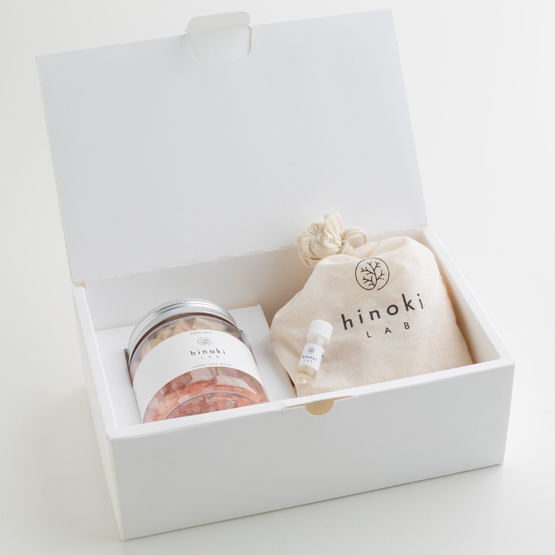 上質なひのきの香りが楽しめる、ひのき精油と香り袋をセットにした「アロマサシェ&精油」、ひのきの精油とヒマラヤ岩塩をブレンドした「ヒノキラボ バスソルト」を、ギフトセットにしてご用意しました。箱を開けるとふんわりとひのきの香りが広がります。香り好きの人や新生活を始める人、大切な人へ、癒しの時間を贈り物に。専用ギフトボックスにいれてお届けします。