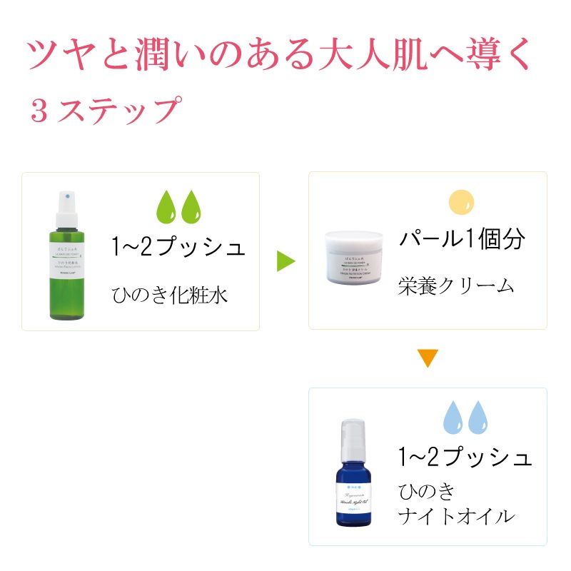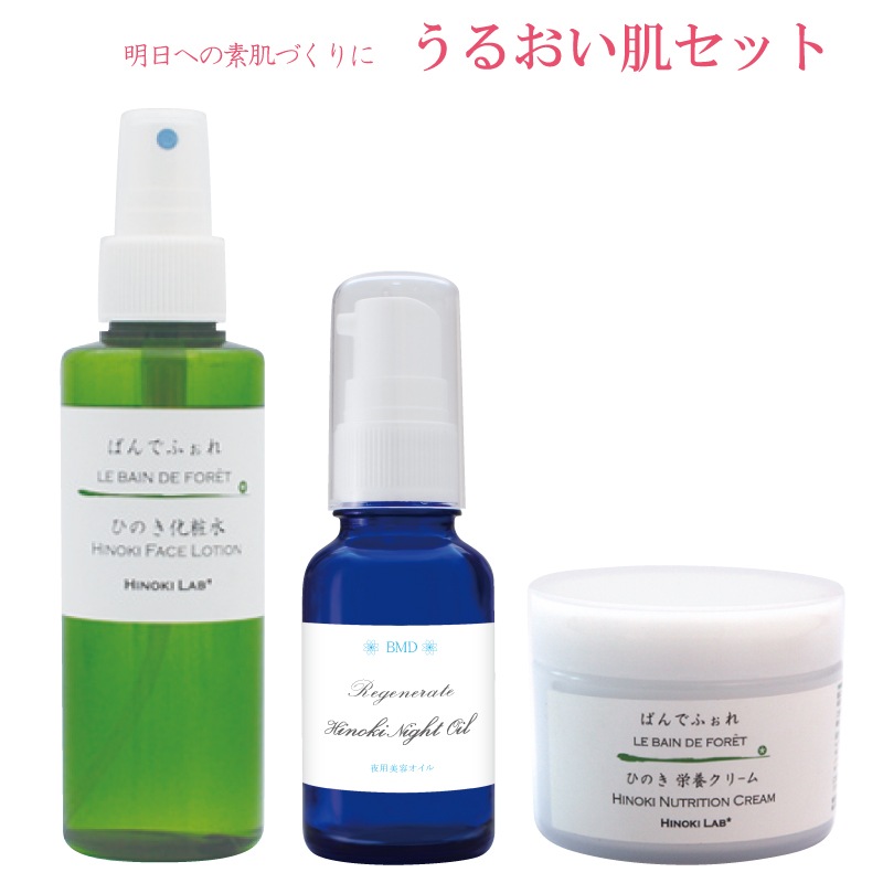 | 内容 | ひのき化粧品(150ml)×1本 ひのき栄養クリーム(50ml)×1個 ひのきナイトオイル(35ml)×1本 |