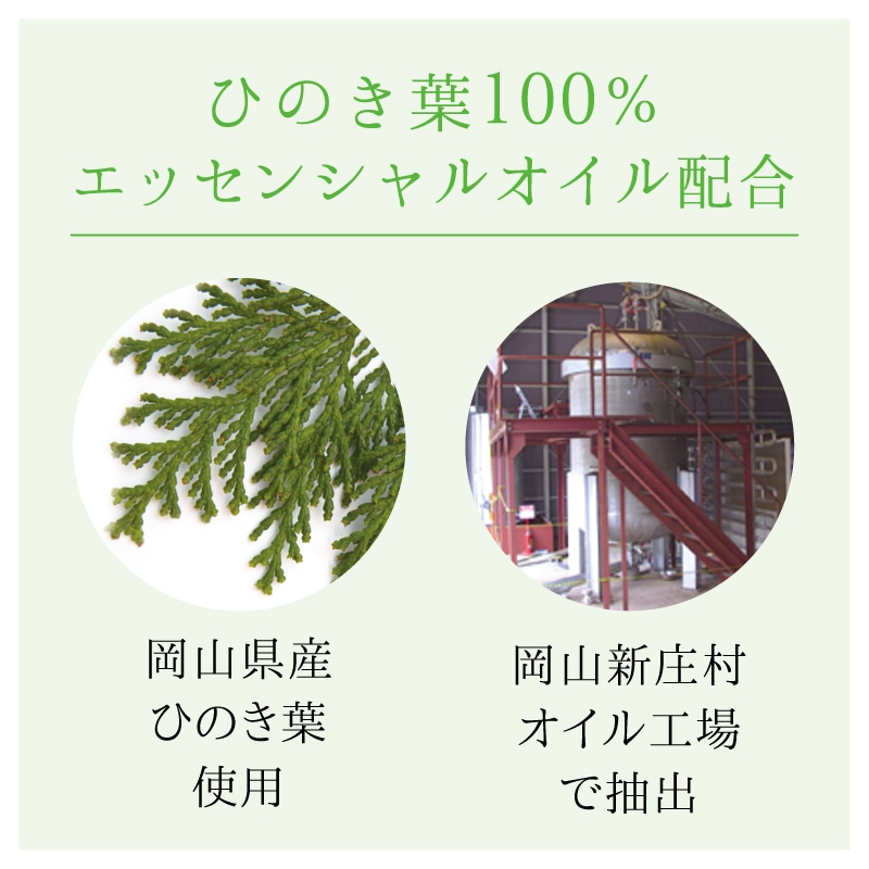 | 継続することが、うるおい美肌を保つ一番の秘訣。 肌を美しく保つための保湿を重視した、特別なセットをご用意しました。 水蒸気蒸留法で自社抽出した、上質ひのき葉精油を配合。 香りは大脳に直接影響する、だからこそアロマにもこだわっています。 |